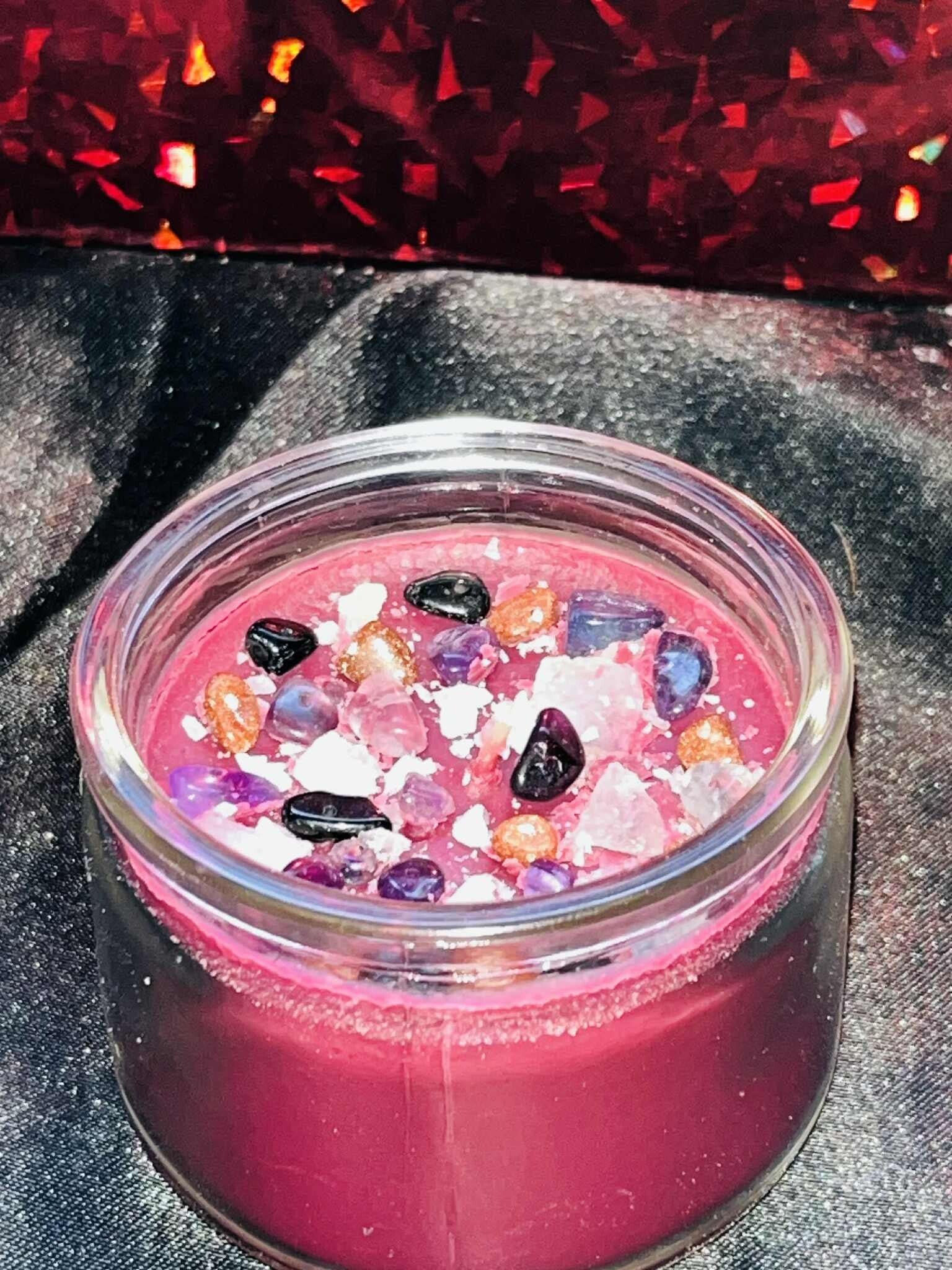 Set of 3 candles, (raspberry, black cherry, & Strawberry fragrance) with crystal quartz, amethyst, obsidian, flourite, & sandstone